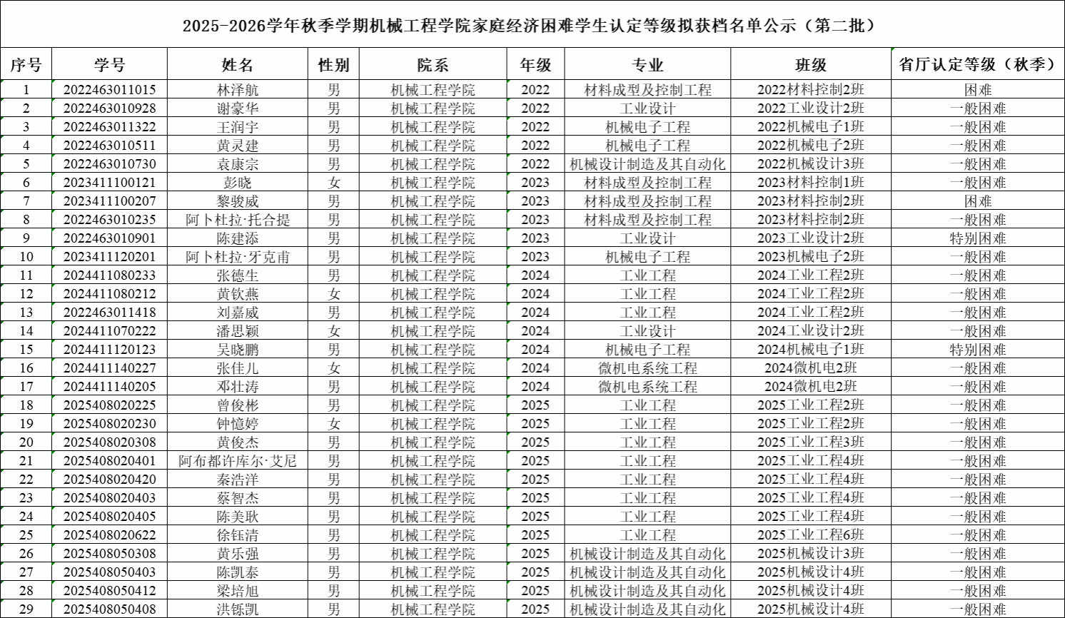 根据《关于做好2025年国家奖学金、国家励志奖学金、国家助学金及新生资助评审工作的通知》(学工通〔2025〕27号) 的文件精神,现对我院2025-2026学年秋季学期家庭经济困难学生认定等级拟获档名单(第二批),进行为期3个工作日的公示。若对人选有不同意见或发现人选有违规行为请通过电话、来函、来访、电子邮件等方式向学院学生工作办公室反映,反映问题实事求是,电话、信函和电子邮件应告知真实姓名。